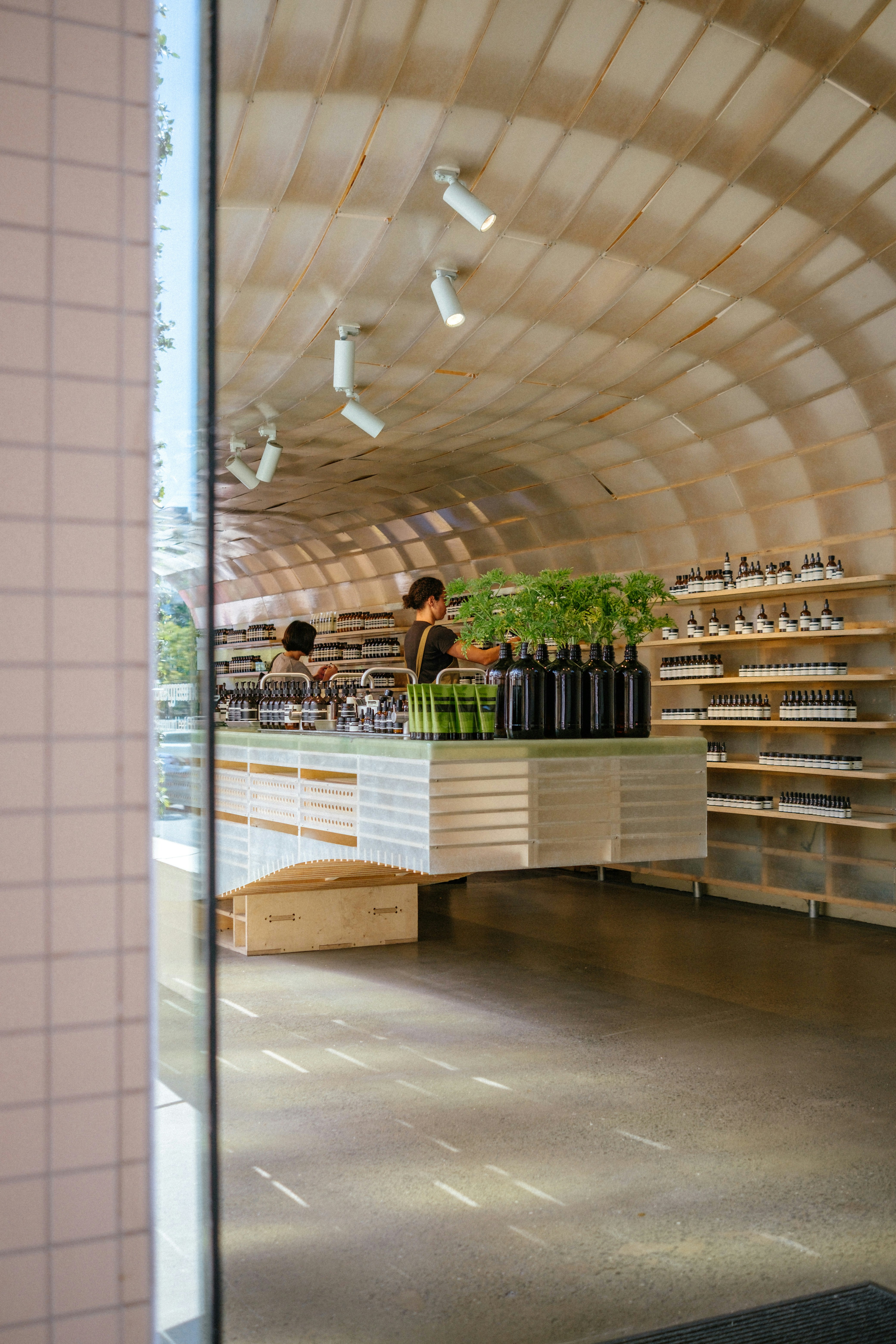 Curved pathways encourage exploration of the entire space rather than quick in-and-out visits. Living walls become Instagram-worthy backdrops that generate social media exposure. Natural materials signal quality and authenticity, supporting premium positioning.