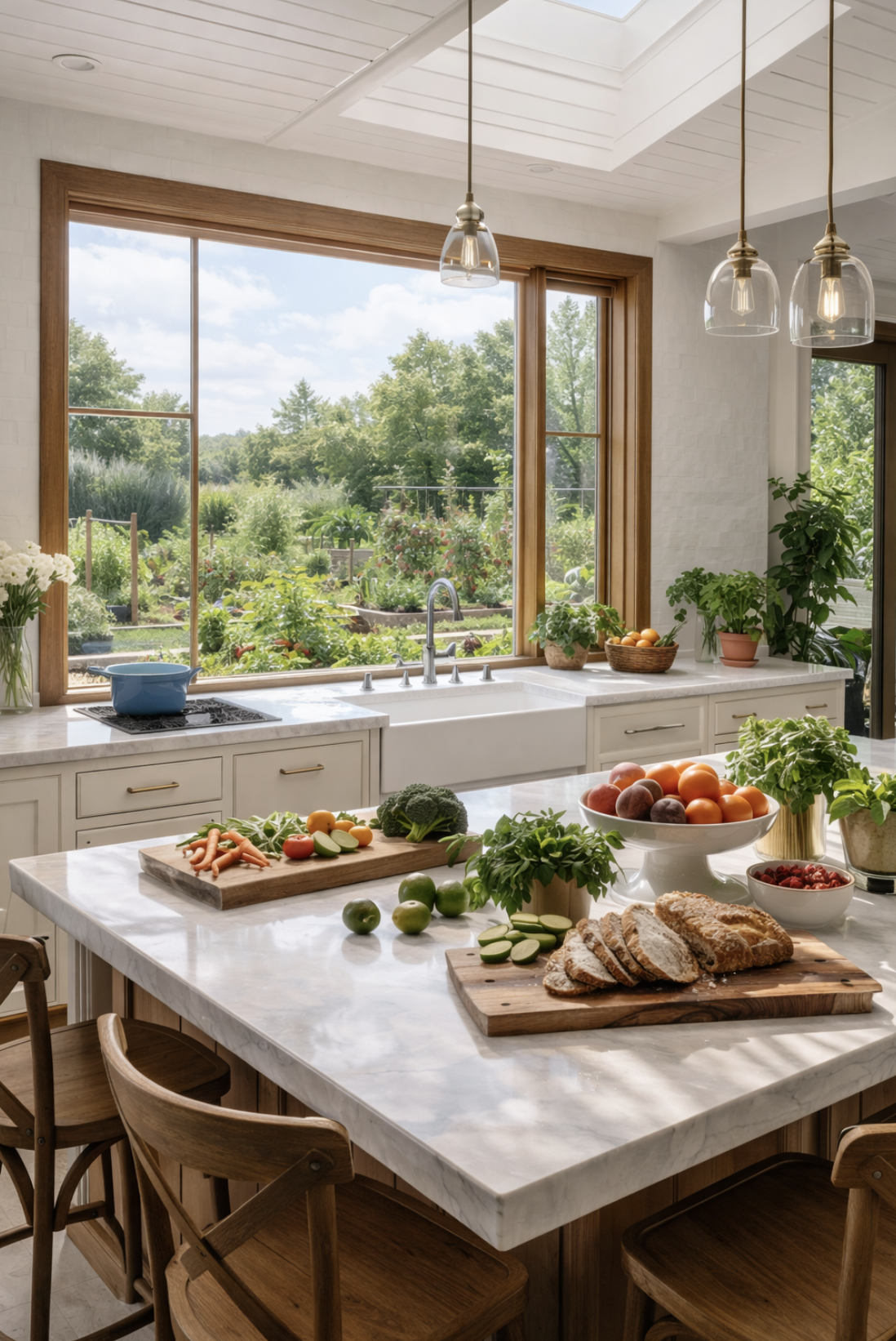 Create tangible connection between food preparation and natural processes. A window overlooking a vegetable garden makes the source of food visible. Seasonal fruit displays connect meals to natural growing cycles.